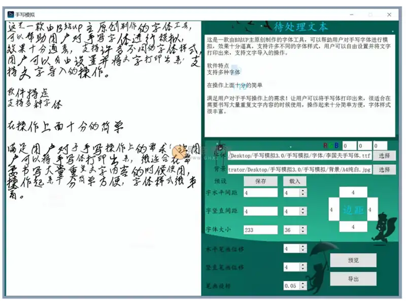 这是一款由B站UP主原创制作的字体工具,可以帮助用户对手写字体进行模拟,效果十分逼真,支持许多不同的字体样式,用户可以自由设置并将文字打印出来,支持文字导入的操作。