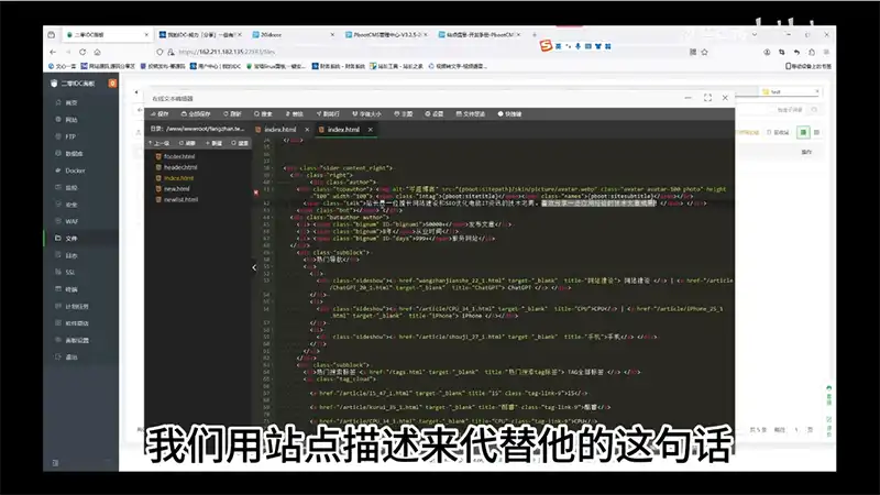 hello,大家好,今天来给大家讲解一下pbootcms的仿站。今天我们主要讲解的内容是进行一个中间内容,中间内容部分的一个调用。大家可以看到这里它是一张图片, 一个新闻列表,然后这边是一个头像,一个介绍,然后这边是一个导航,然后一个标签,然后下面这里又是一个文章,以及最后的这里的友情链接,然后这里的友情链接,我们在这下面已经调用过了。所以说这里的话,我们就可以在调用途中给它删掉。然后现在我们回到宝塔,然后大家可以看到这里。